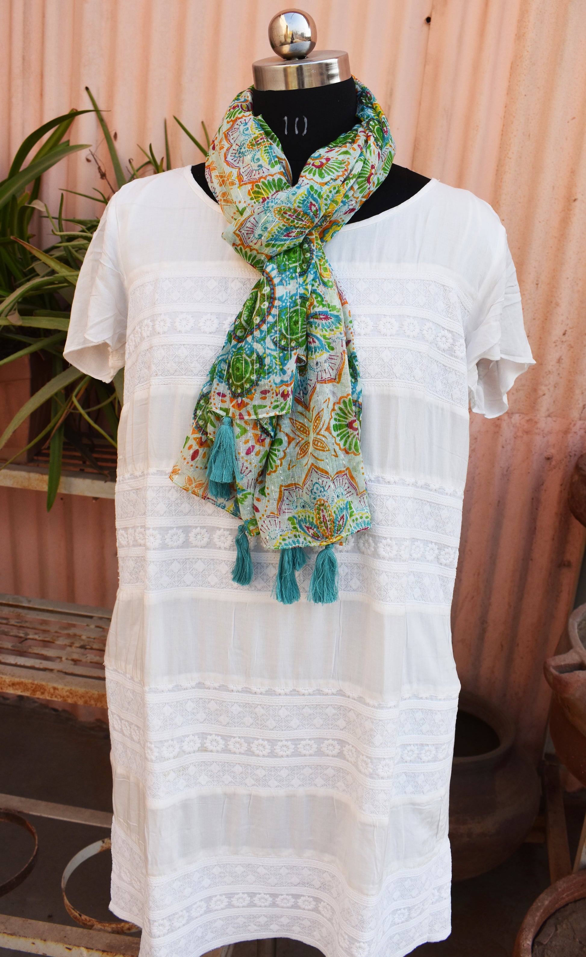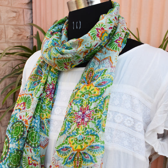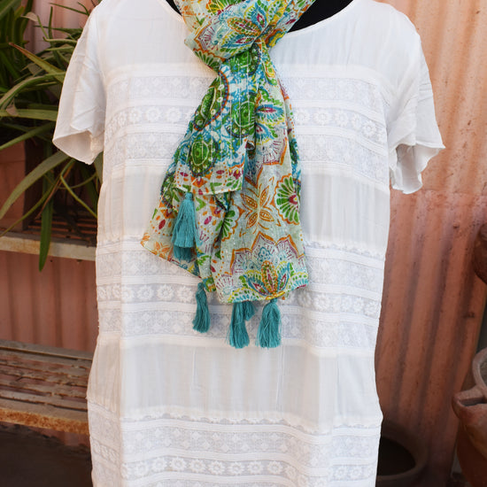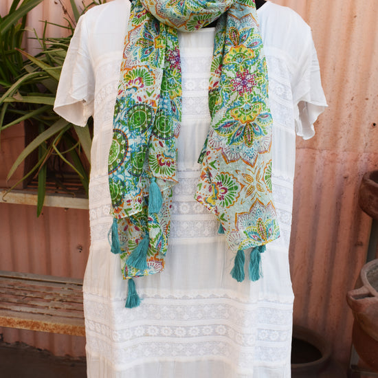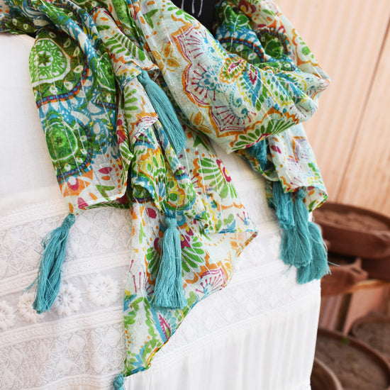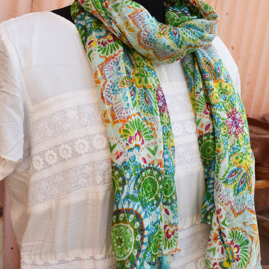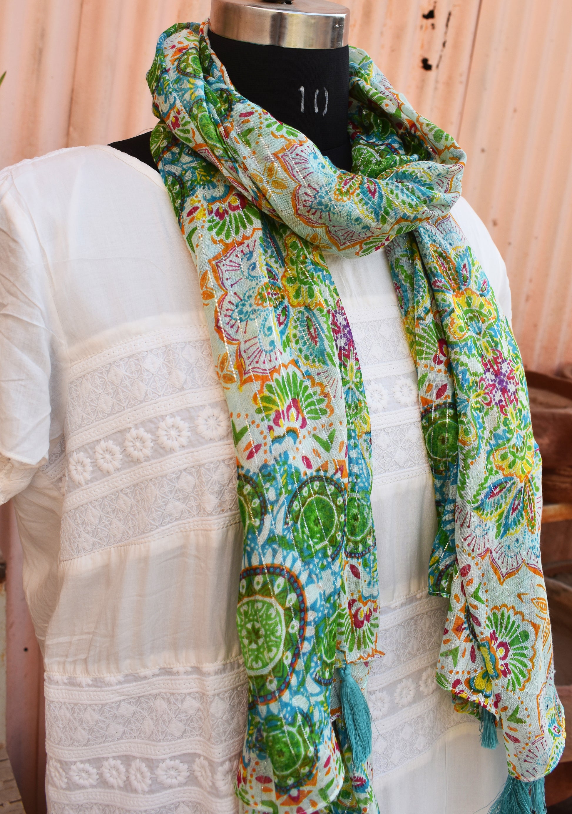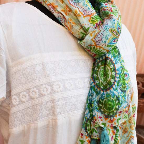 Fresh and eye-catching, this green kaleidoscope scarf is perfect for uplifting neutral outfits. Lightweight and comfortable, it’s ideal for travel, brunch looks, or everyday layering.