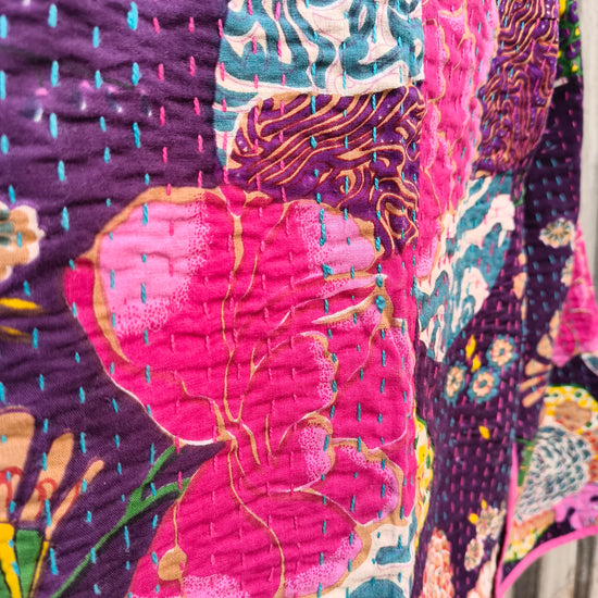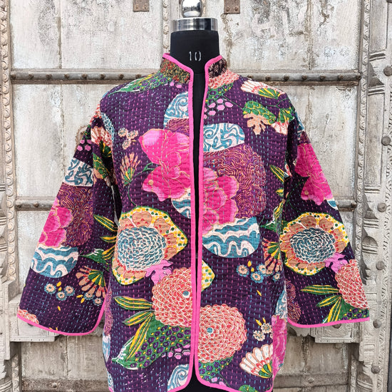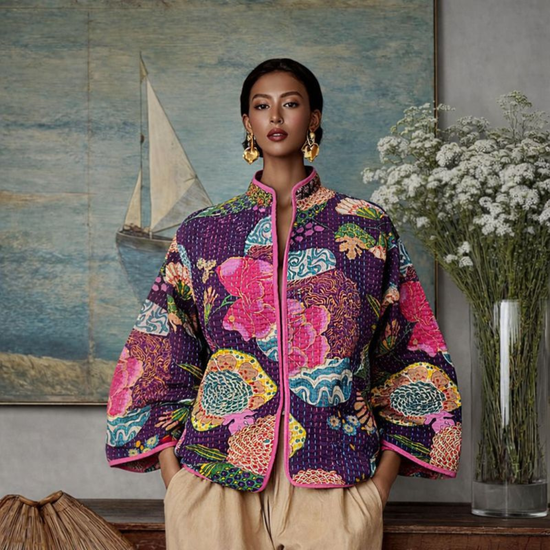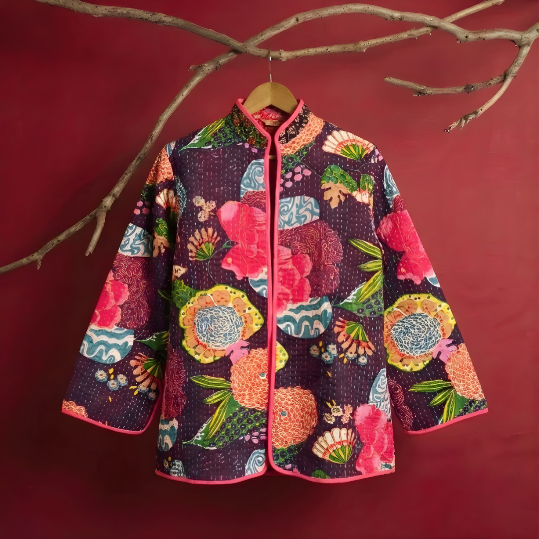 The Kantha Bloom Jacket is a handcrafted cotton jacket made with traditional kantha stitching and vibrant handprinted floral patterns. Designed in a relaxed short-jacket silhouette with contrast piping, it celebrates artistic expression and timeless craftsmanship.