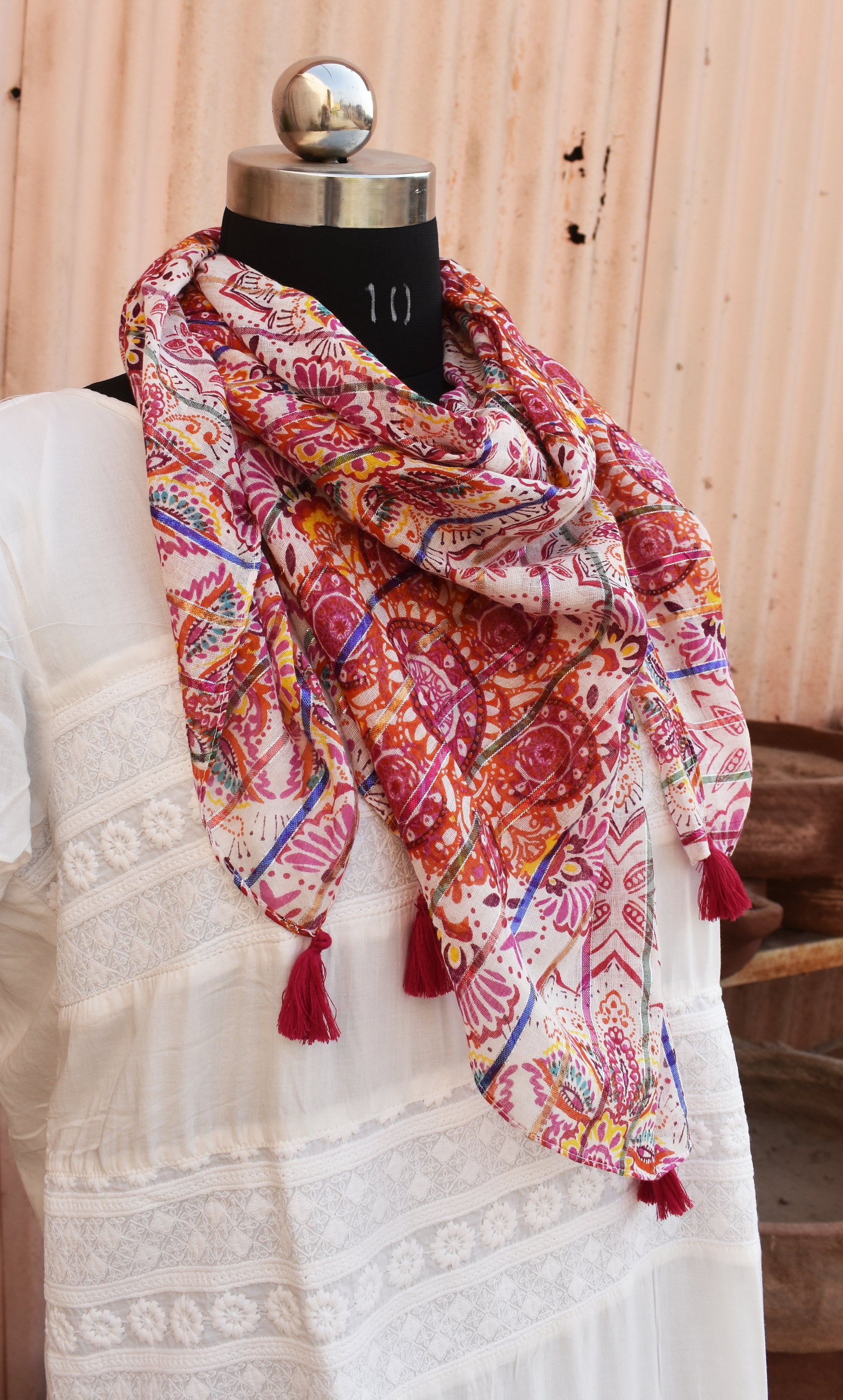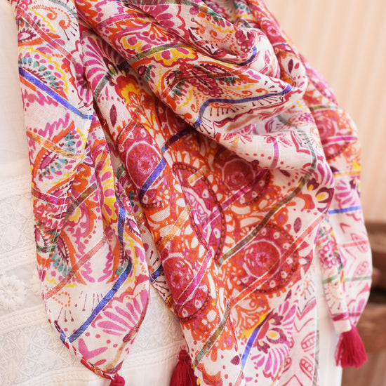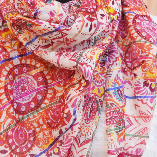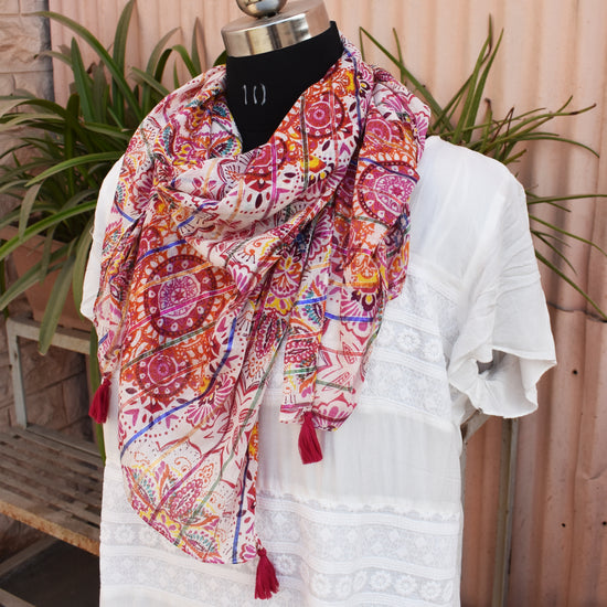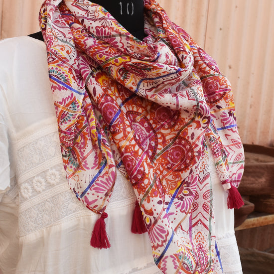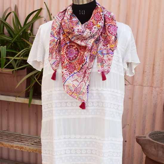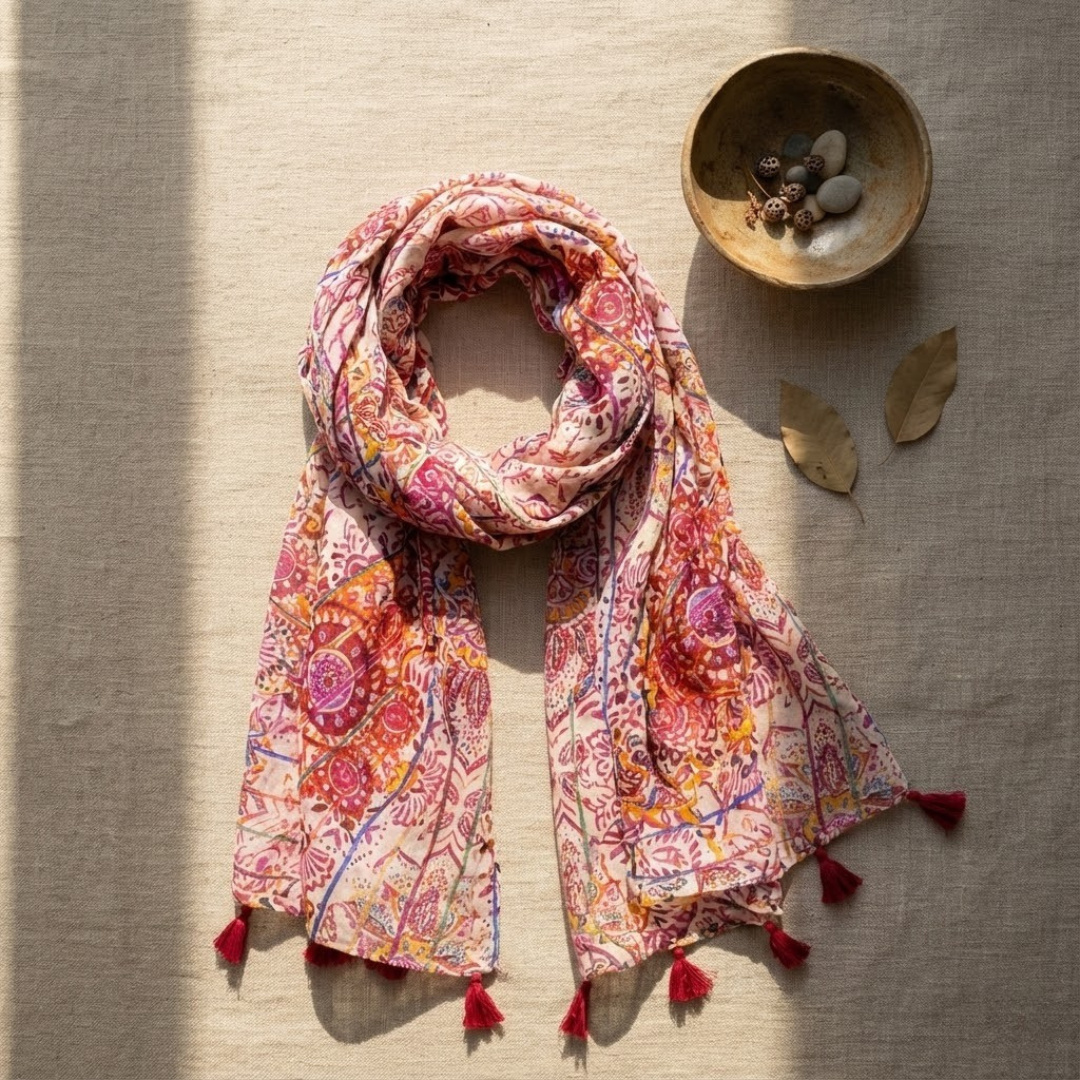 Bright and feminine, the pink kaleidoscope printed scarf adds a playful touch to casual and festive outfits. Its soft feel and generous length make it easy to style in multiple ways—wrap, drape, or knot.