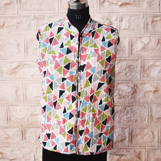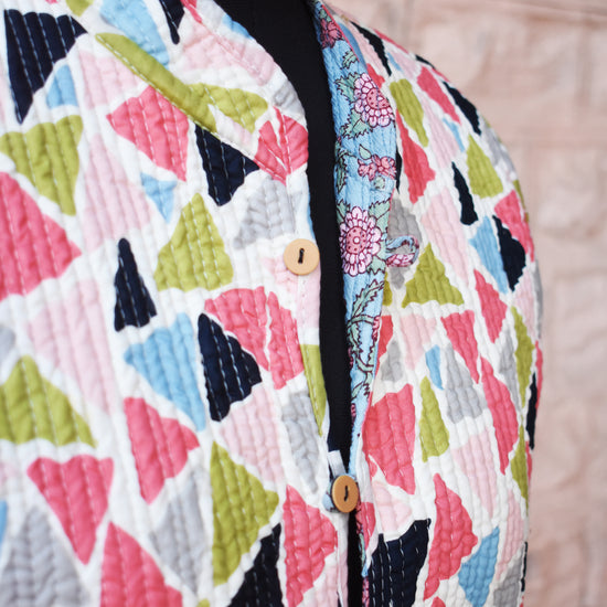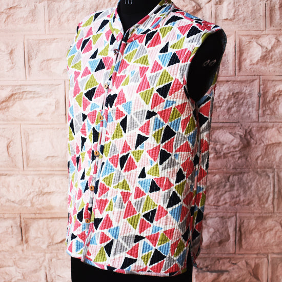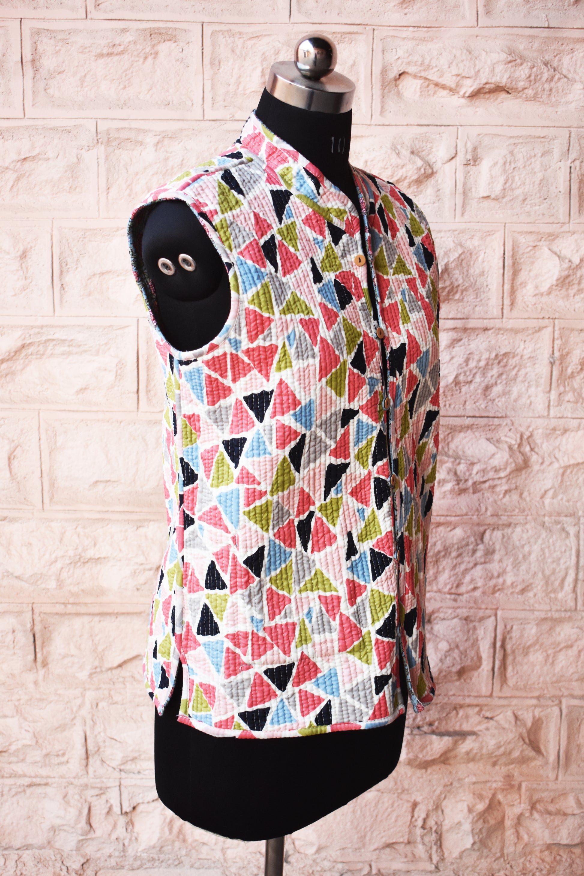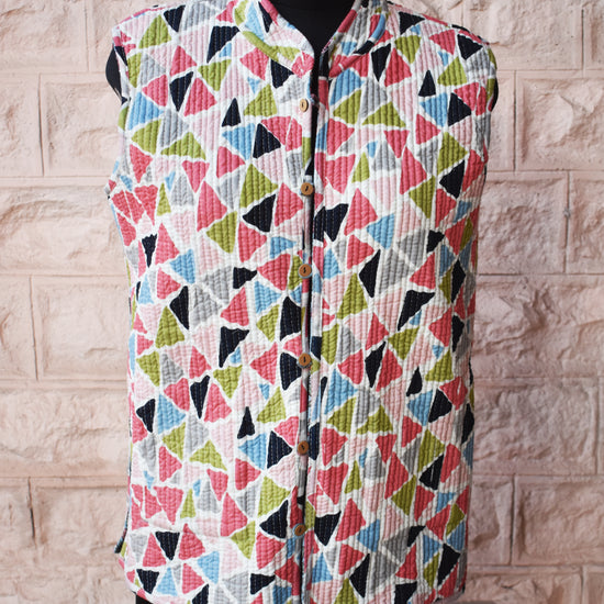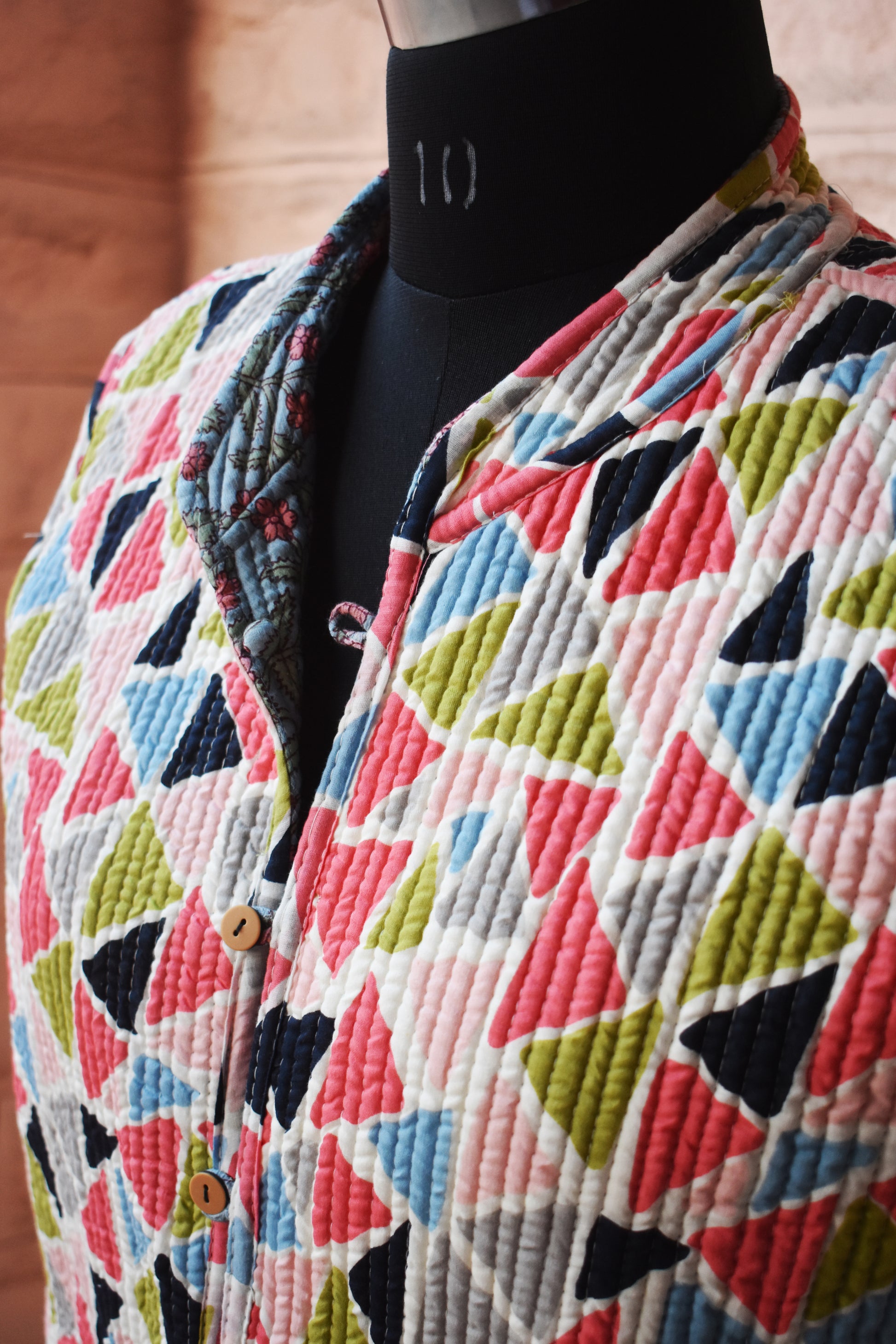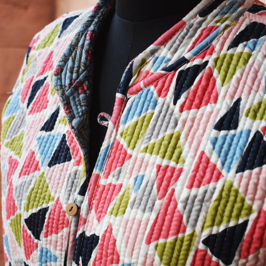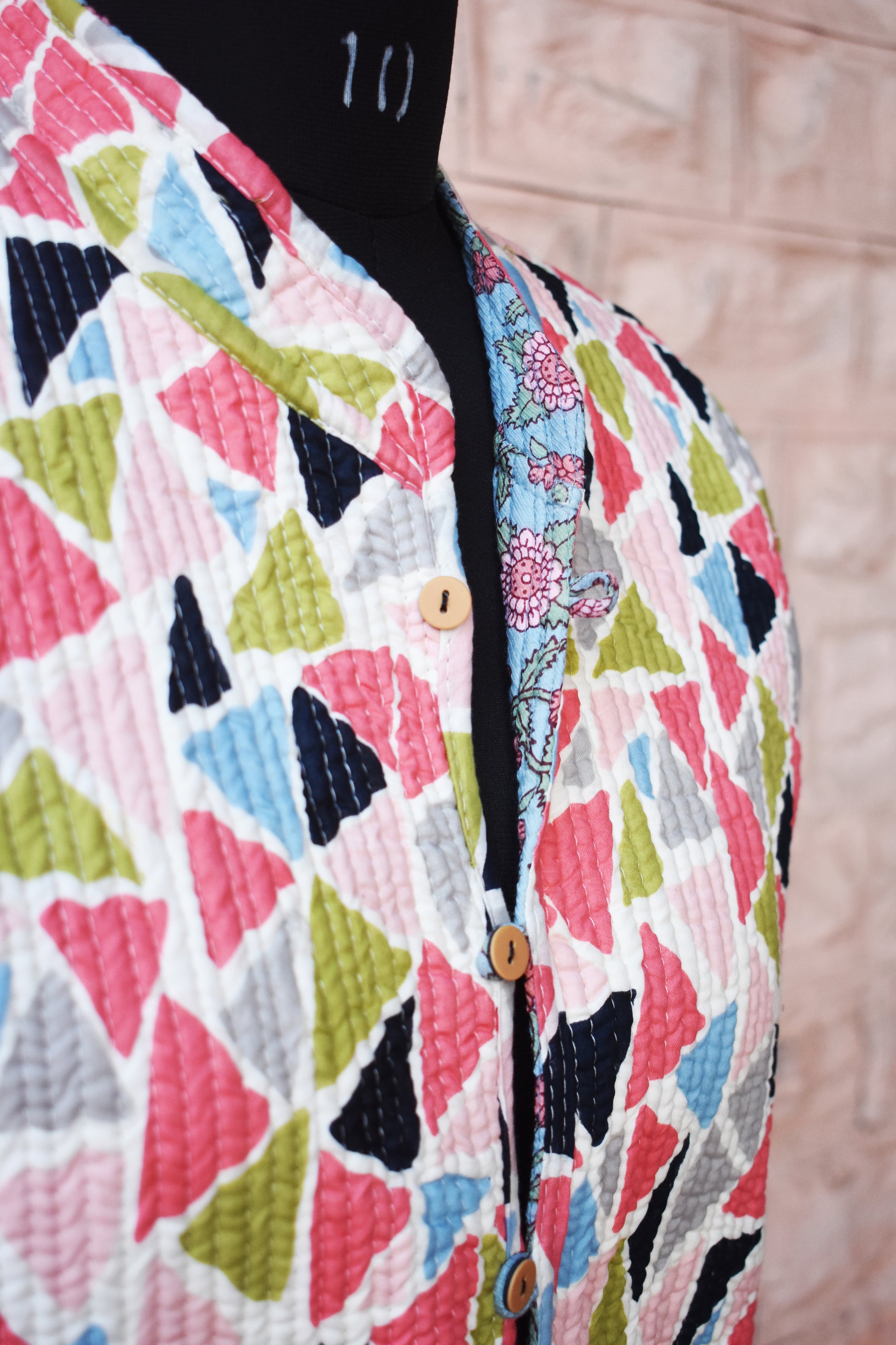 The SangaShapes TwinSide Quilted Wear blends classic Sanganeri-style prints with contemporary geometric screen designs on pure cotton fabric. Filled with soft pure cotton for a cozy, quilted feel, it offers warmth without compromising breathability. Its fully reversible construction provides two uniquely stylish looks in one—perfect for everyday wear, travel, and artistic layering.
